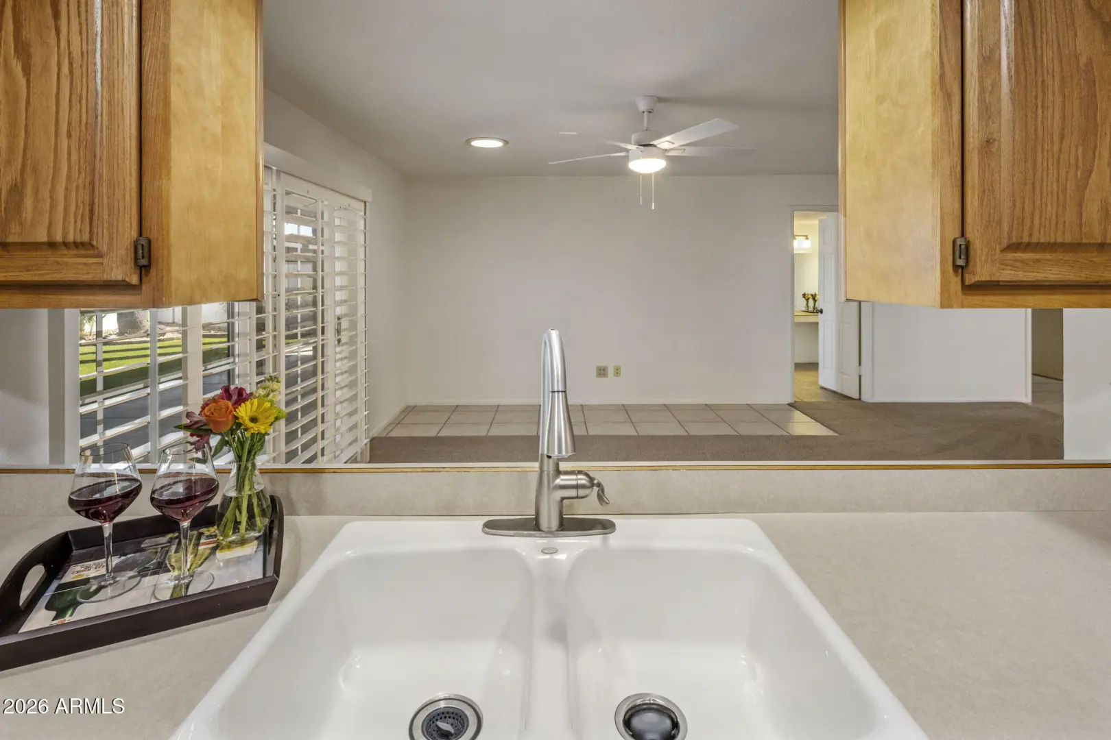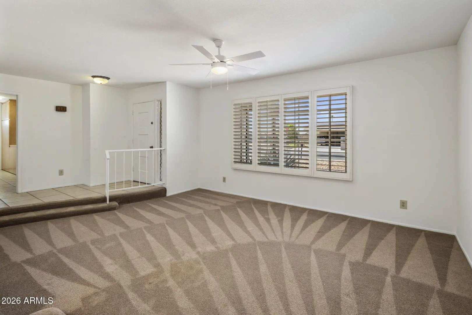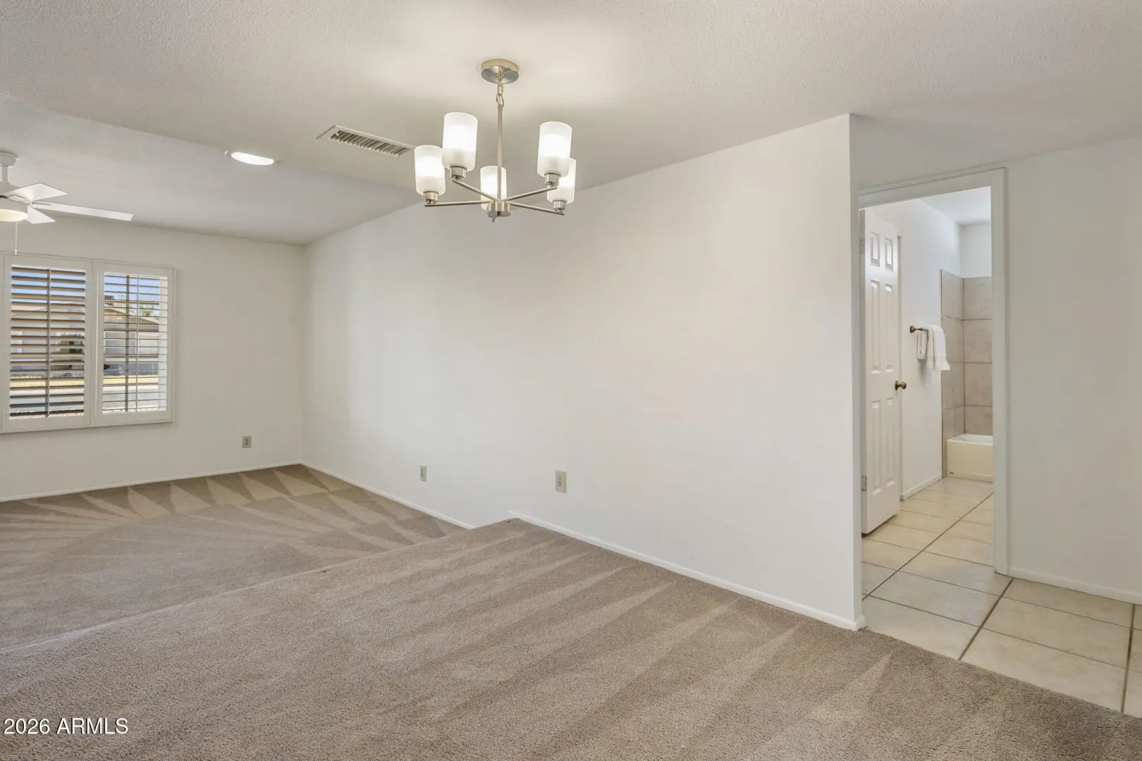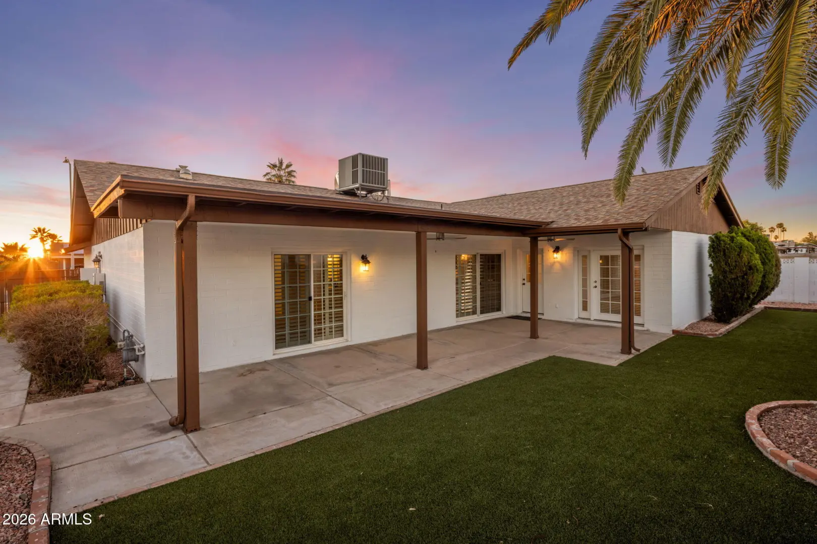 Beautifully refreshed single-story home on a corner lot offering 2,352 sq ft with a desirable split floor plan featuring two primary suites-each with attached bath & private backyard access. Fresh interior paint, plantation shutters throughout, and updated LED kitchen lighting enhance the light, open layout. Kitchen features new Whirlpool stainless steel appliances (2023). Primary suite includes a renovated shower (2024). Enjoy a low-maintenance backyard with turf, mature palm trees, & an oversized covered patio perfect for entertaining. Additional features include owned solar (18 panels), RV gate, 2-car garage, new thermostat, and large laundry room with plenty of storage. Conveniently located near Banner, ASU West, schools, Loop 101, shopping, dining, & entertainment & sporting venues.