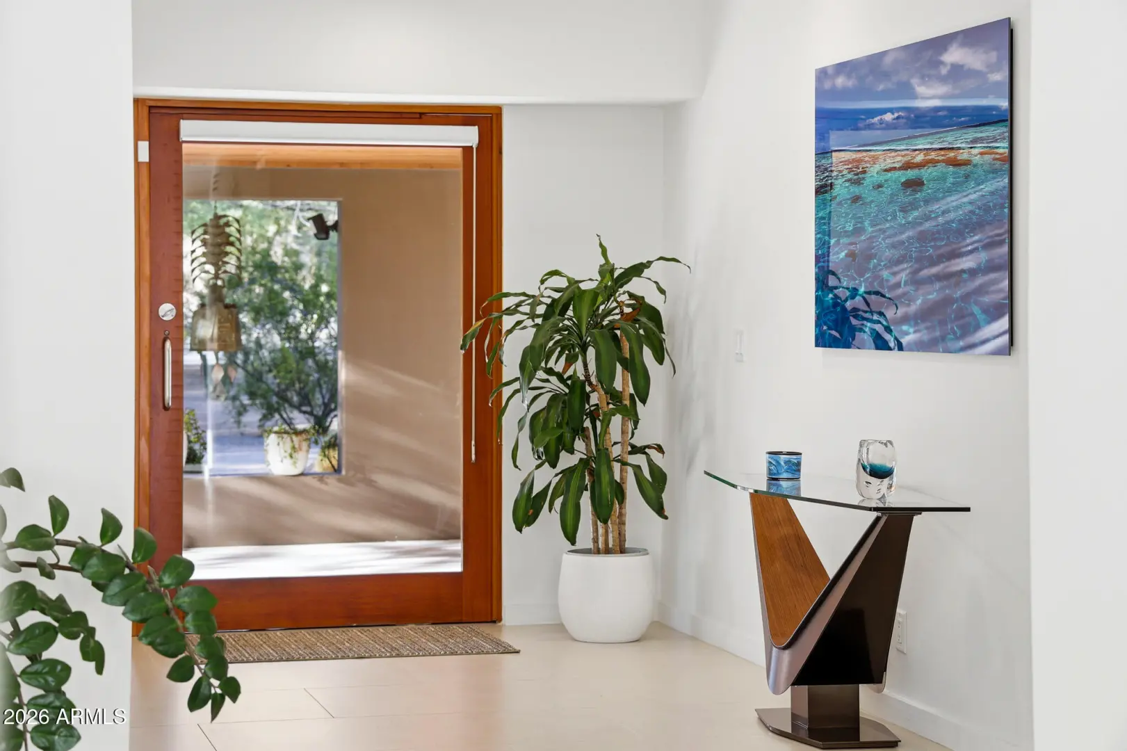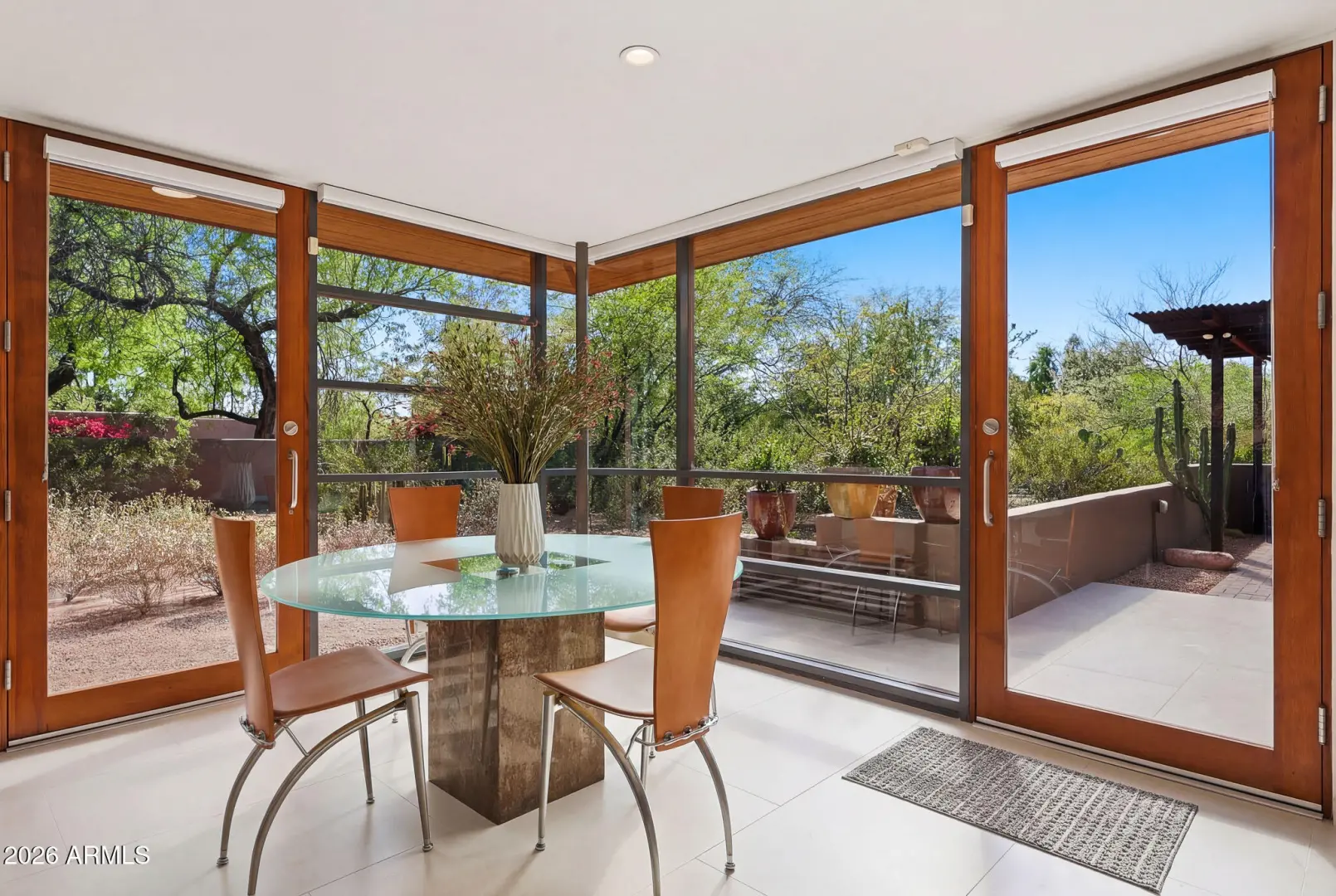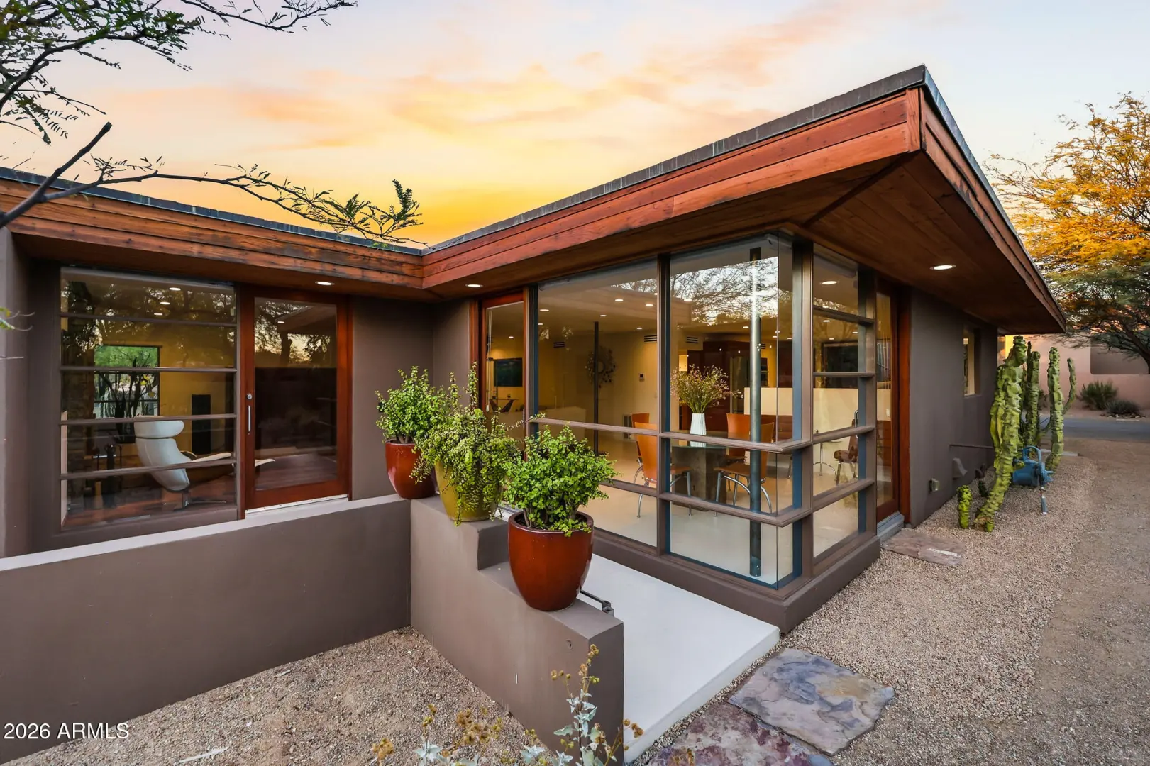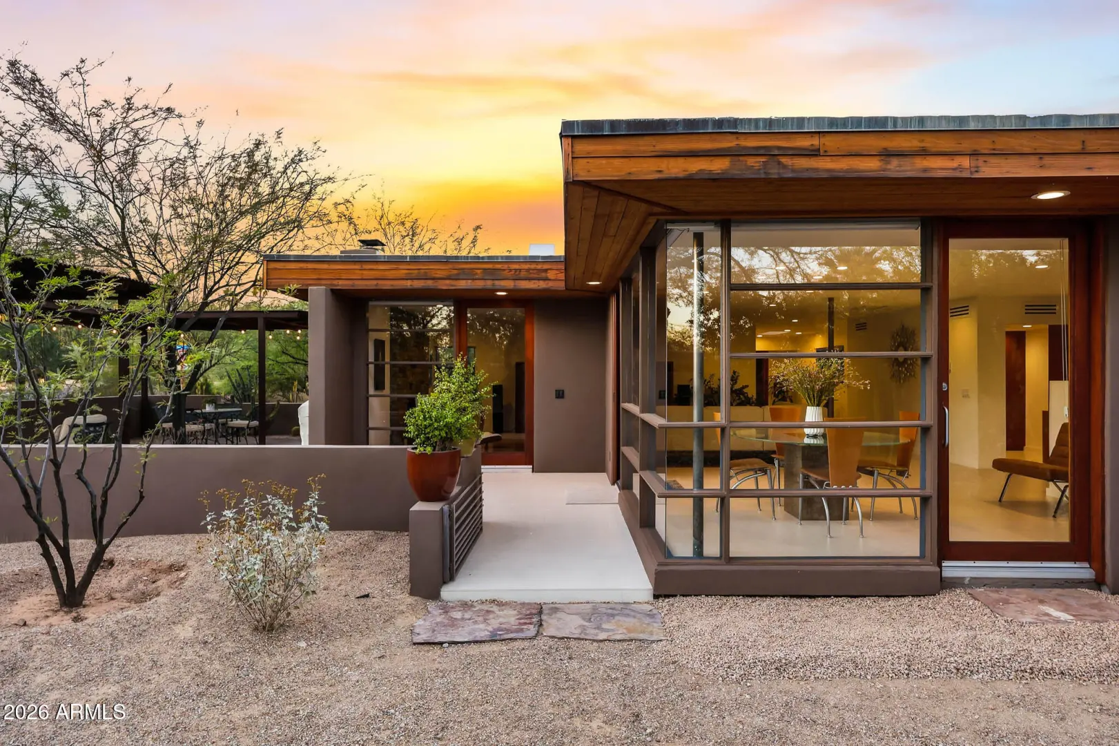 This stunning mid-century modern residence, inspired by the timeless design principles of Frank Lloyd Wright, is ideally located in the heart of Paradise Valley. Offering 3 bedrooms and 3.5 baths, the home combines clean architectural lines with an easy, low-maintenance lifestyle. As you enter, the home opens to a light-filled great room and dining space centered around a cozy wood-burning fireplace. The chef's kitchen features Taj Mahal quartzite countertops, stainless steel appliances including a gas range, and generous storage, all overlooking the main living areas. The flooring throughout includes a blend of large-format 24×48 porcelain tile, Brazilian cherry hardwood, and marble.