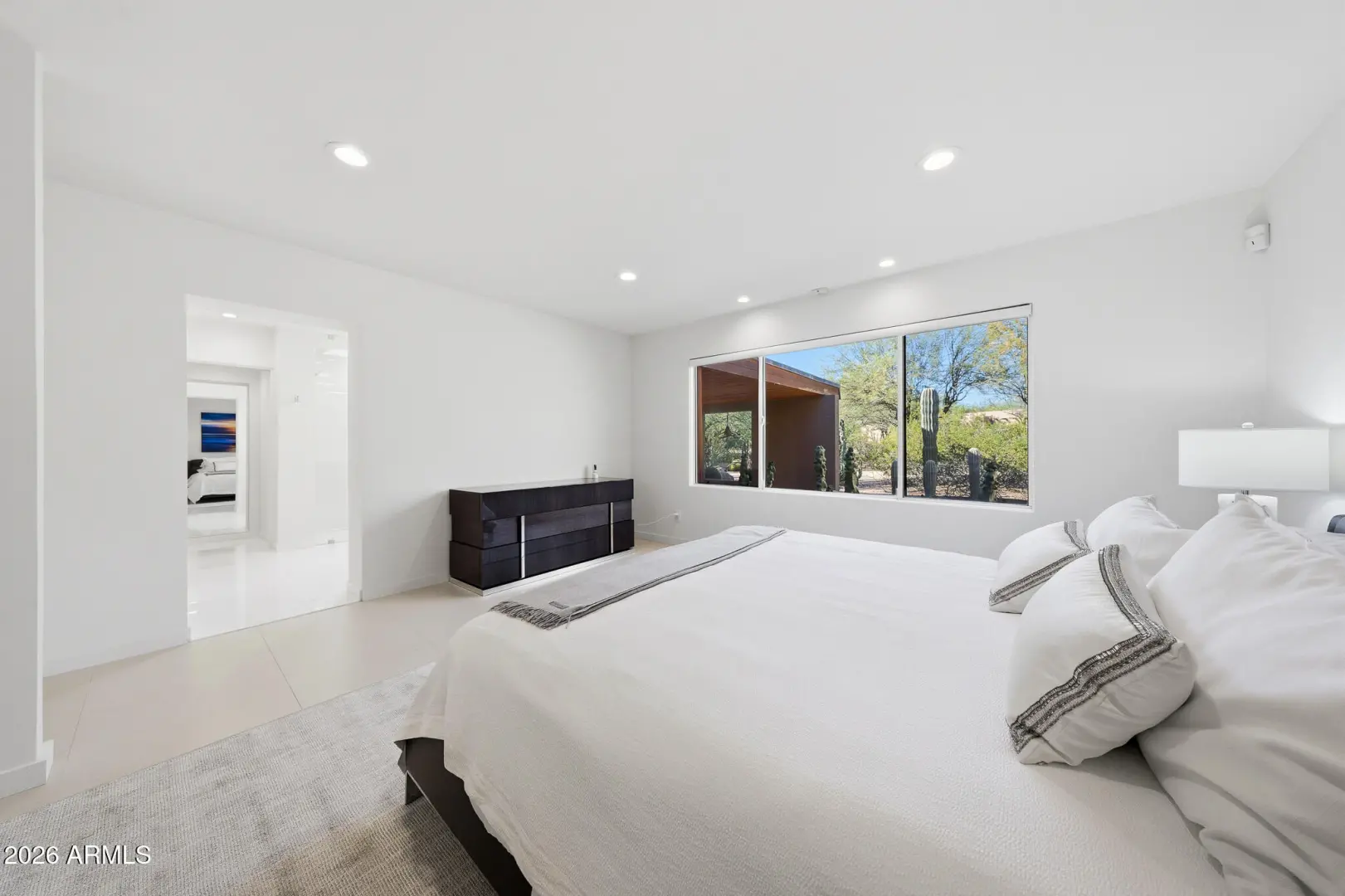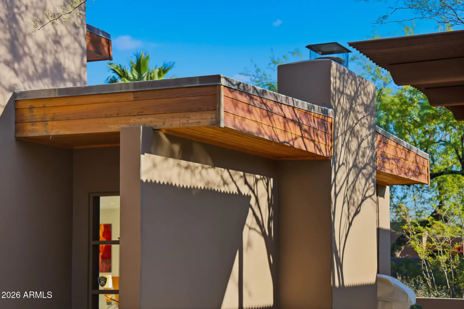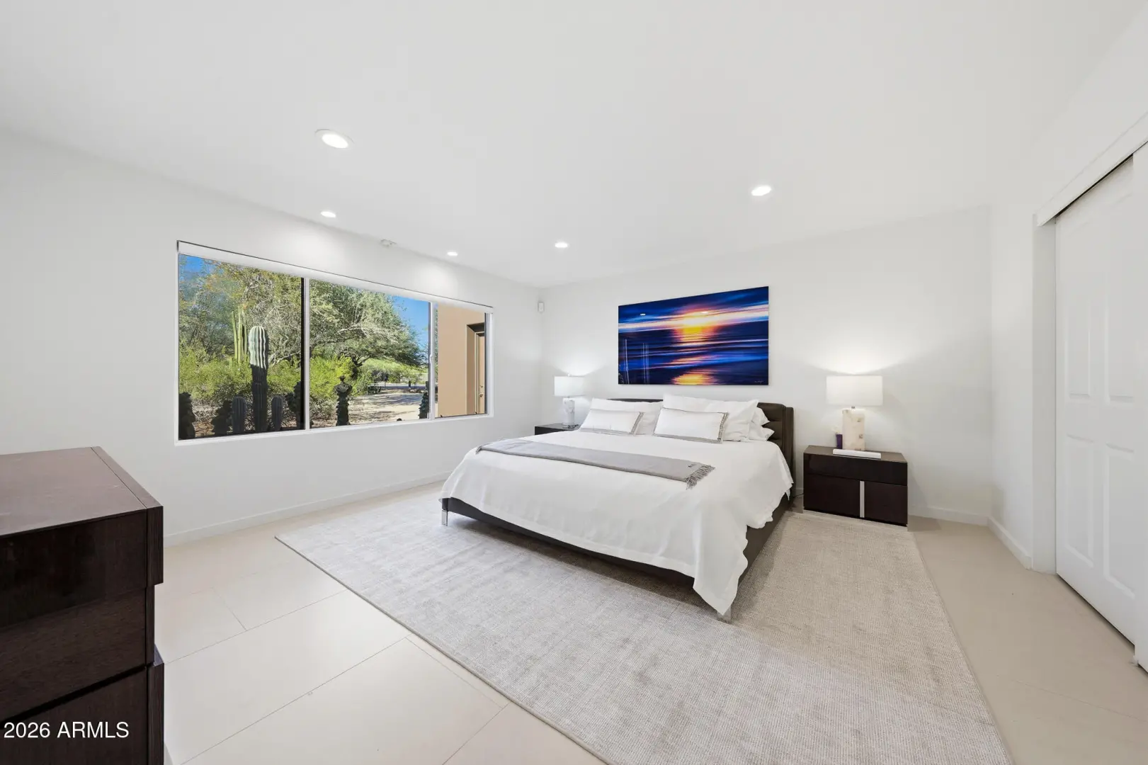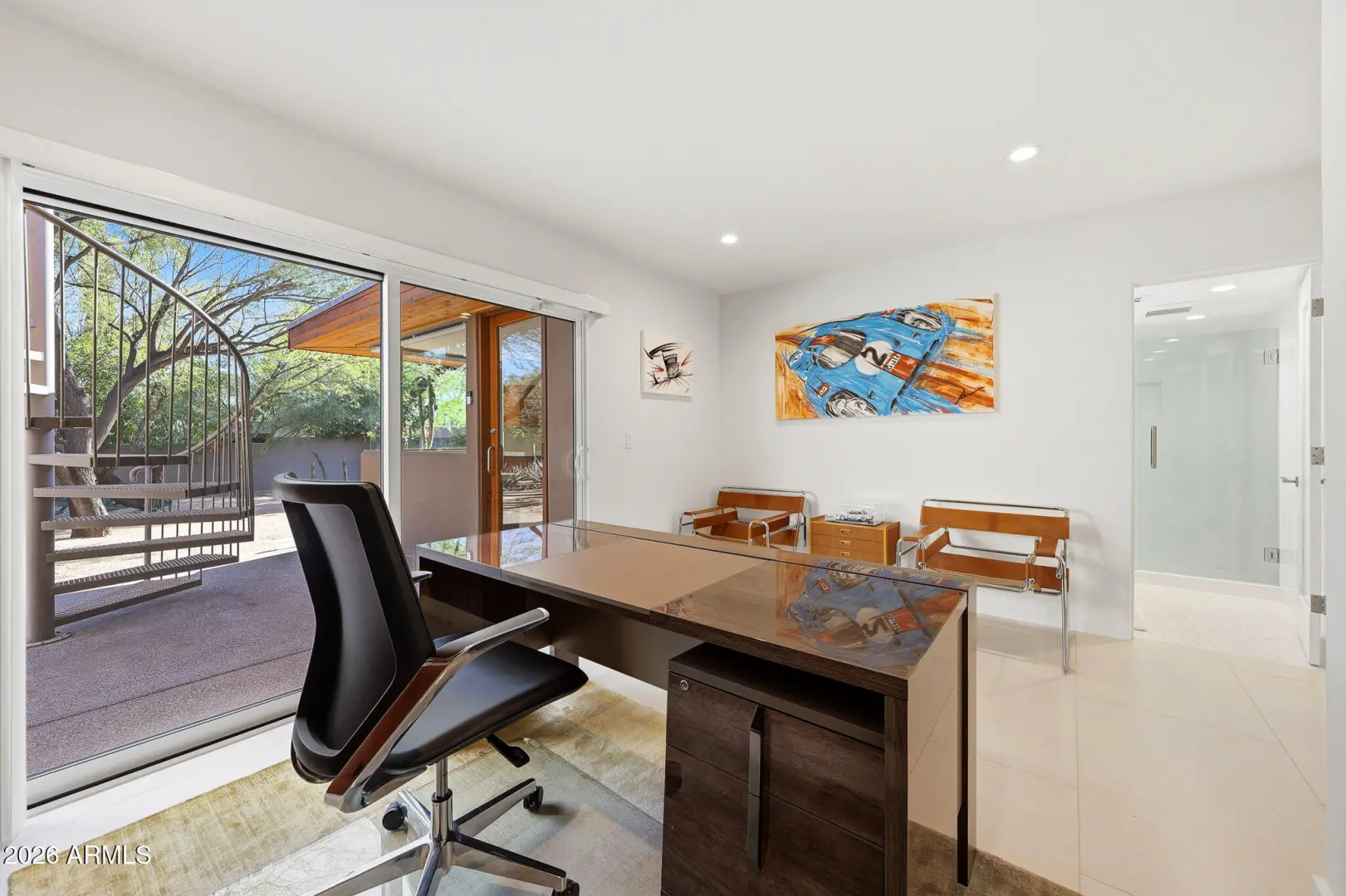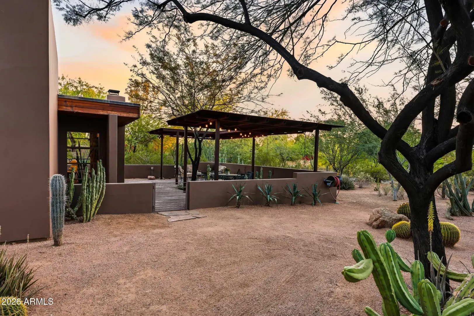 This stunning mid-century modern residence, inspired by the timeless design principles of Frank Lloyd Wright, is ideally located in the heart of Paradise Valley. Offering 3 bedrooms and 3.5 baths, the home combines clean architectural lines with an easy, low-maintenance lifestyle. As you enter, the home opens to a light-filled great room and dining space centered around a cozy wood-burning fireplace. The chef's kitchen features Taj Mahal quartzite countertops, stainless steel appliances including a gas range, and generous storage, all overlooking the main living areas. The flooring throughout includes a blend of large-format 24×48 porcelain tile, Brazilian cherry hardwood, and marble.
