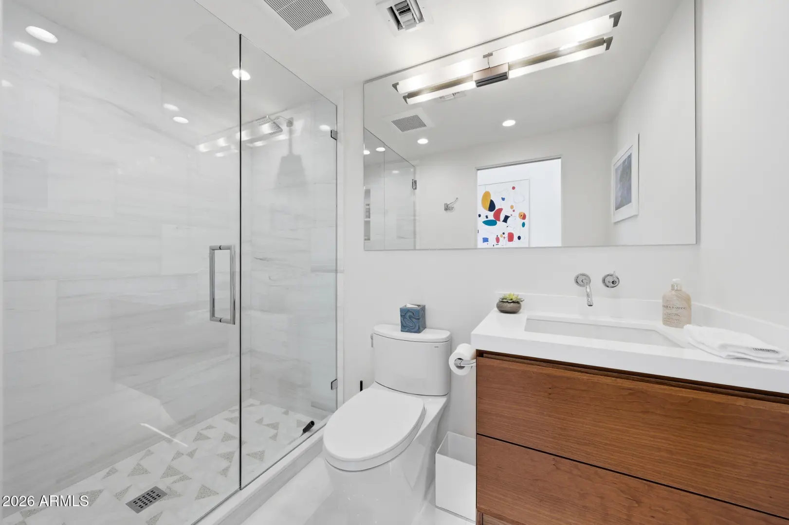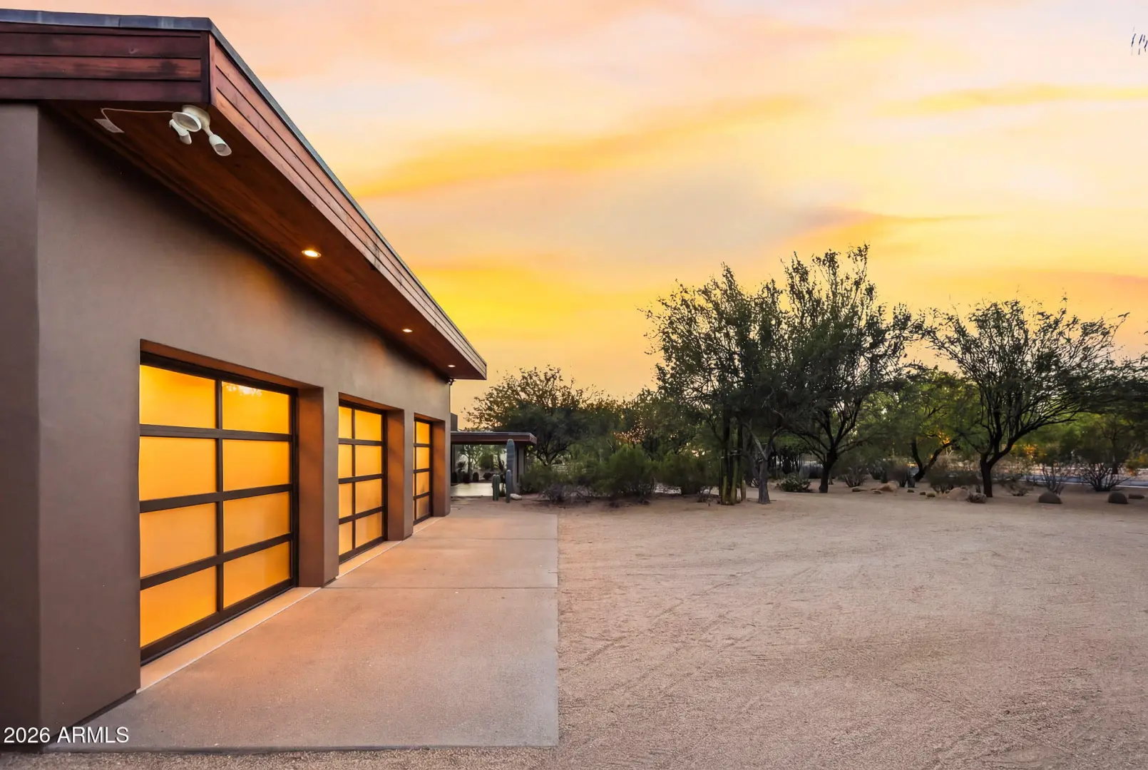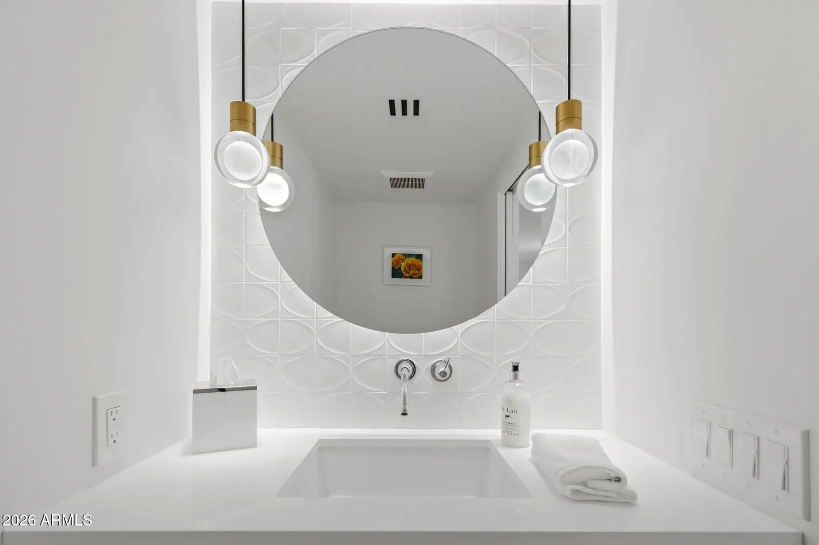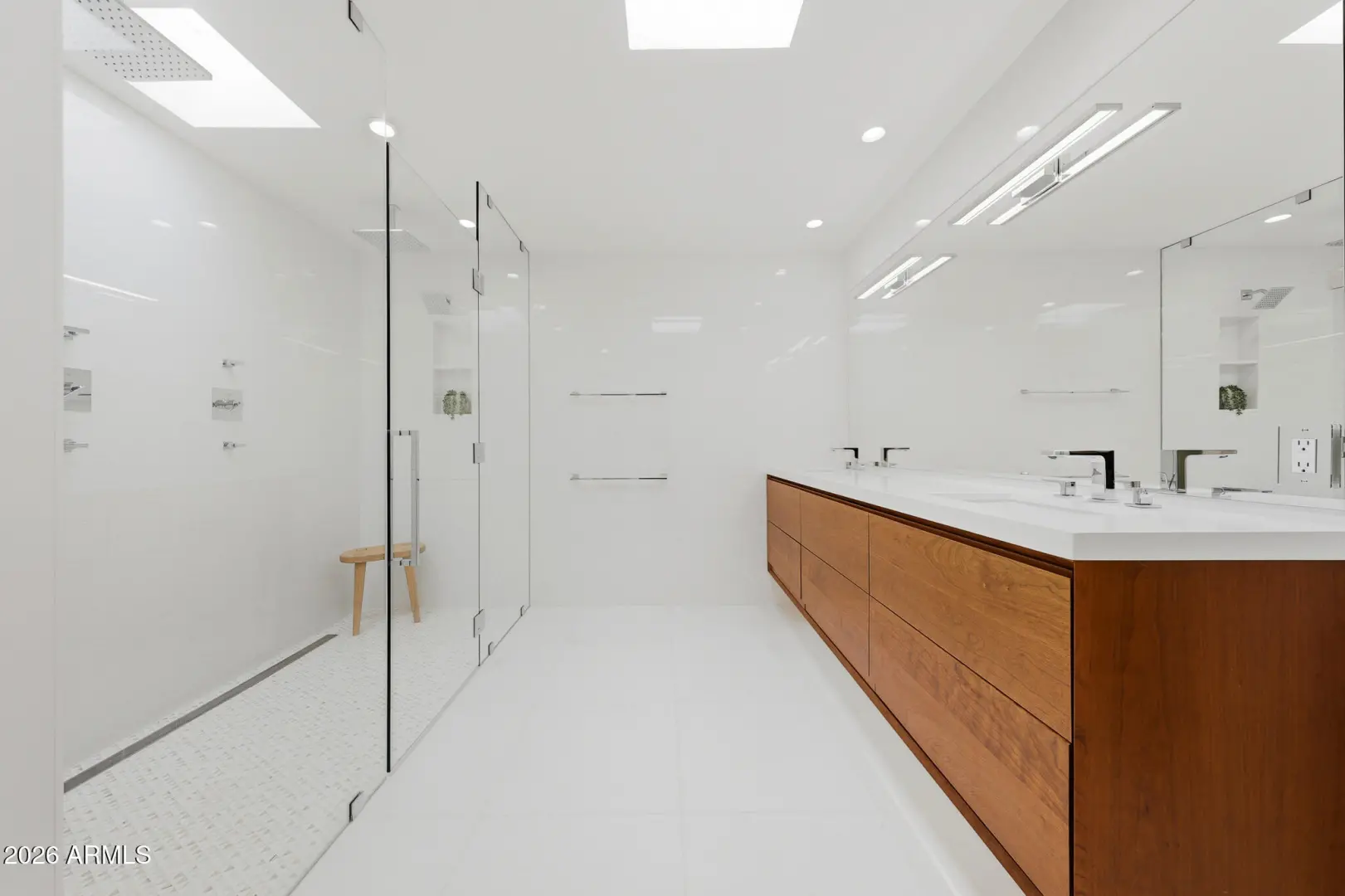 This stunning mid-century modern residence, inspired by the timeless design principles of Frank Lloyd Wright, is ideally located in the heart of Paradise Valley. Offering 3 bedrooms and 3.5 baths, the home combines clean architectural lines with an easy, low-maintenance lifestyle. As you enter, the home opens to a light-filled great room and dining space centered around a cozy wood-burning fireplace. The chef's kitchen features Taj Mahal quartzite countertops, stainless steel appliances including a gas range, and generous storage, all overlooking the main living areas. The flooring throughout includes a blend of large-format 24×48 porcelain tile, Brazilian cherry hardwood, and marble.