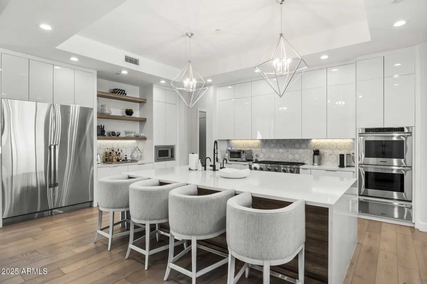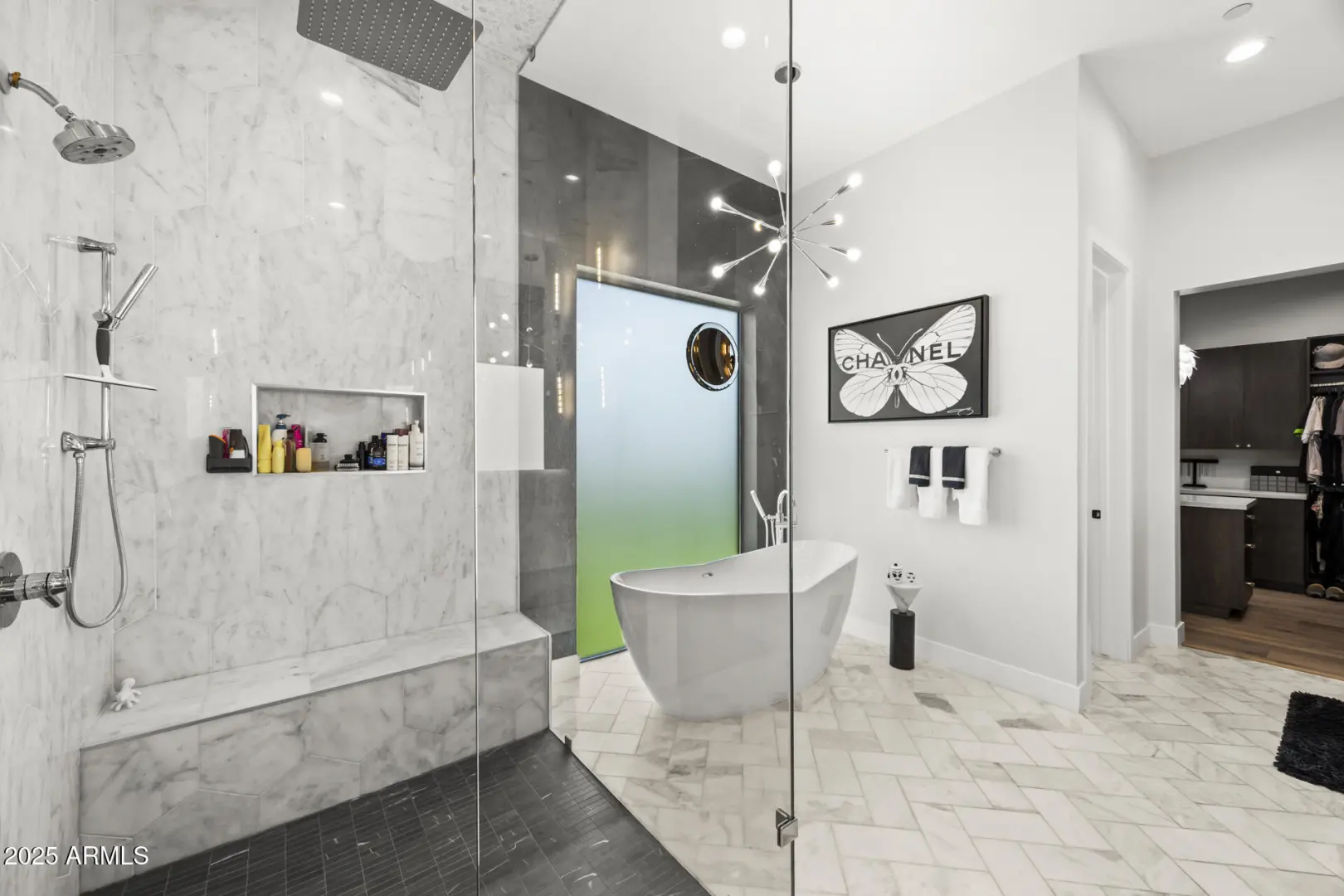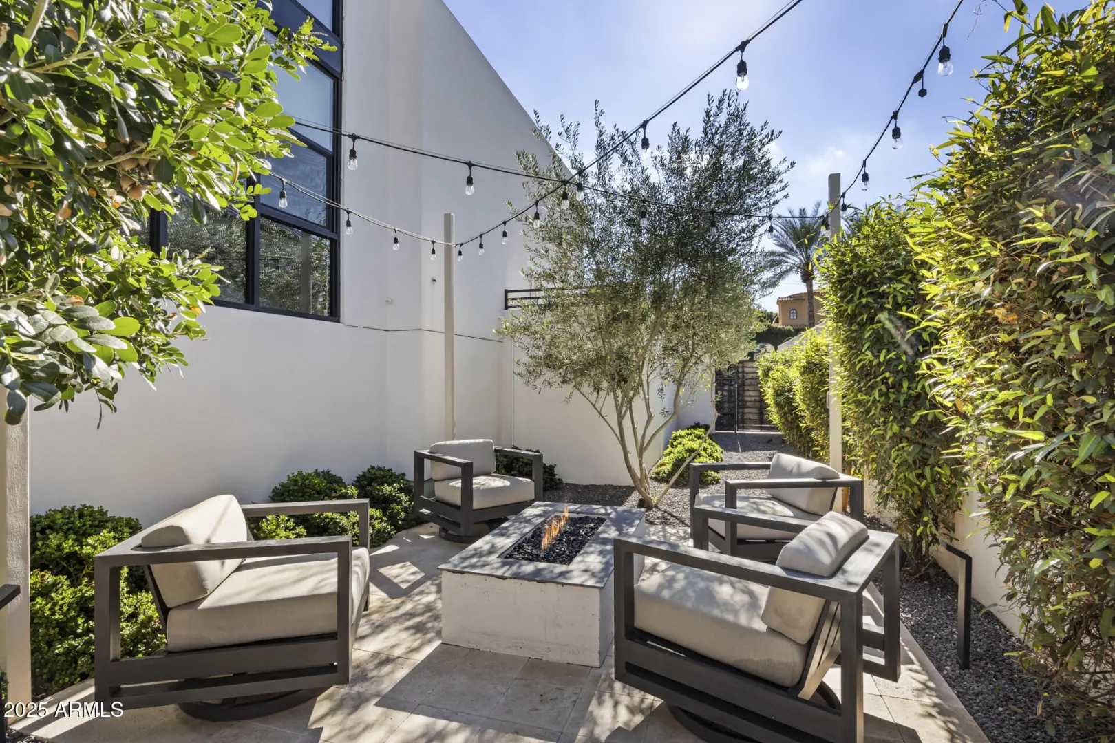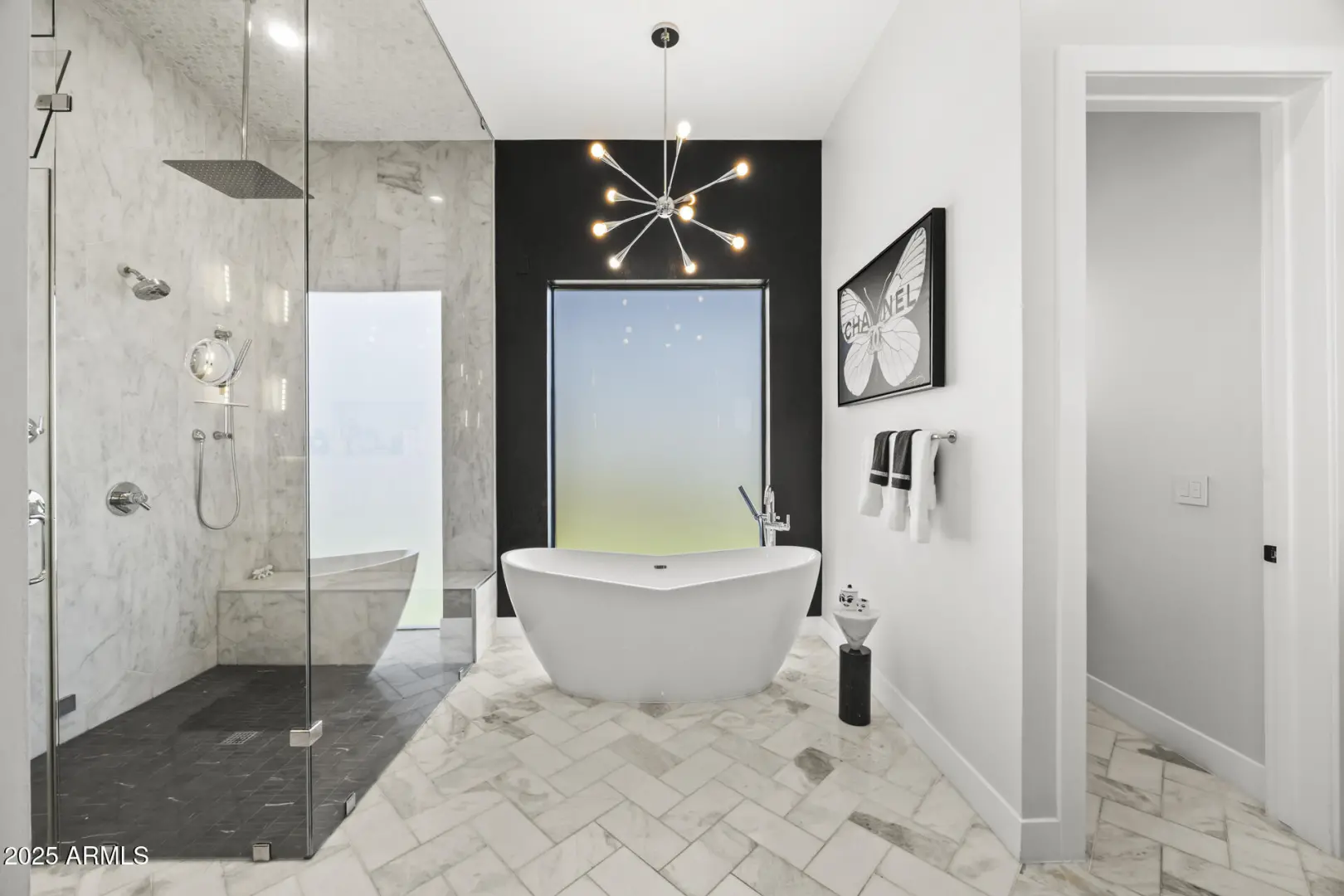 This modern, thoughtfully designed home offers 4 bedrooms, 4.5 baths, and well-planned living spaces that balance comfort and style. The main living area features a striking marble fireplace and exposed beams, creating a clean and elevated look. The open gourmet kitchen includes sleek white cabinetry and a large Calacatta quartz island that connects easily to the dining area, making the space great for everyday living and entertaining. The primary suite provides a relaxing setting with its own fireplace and floor-to-ceiling windows that bring in natural light and calm views. The primary bath includes dual vanities, a walk-in shower, a soaking tub, and a spacious walk-in closet. Outside, the home offers a private backyard with a sparkling pool,