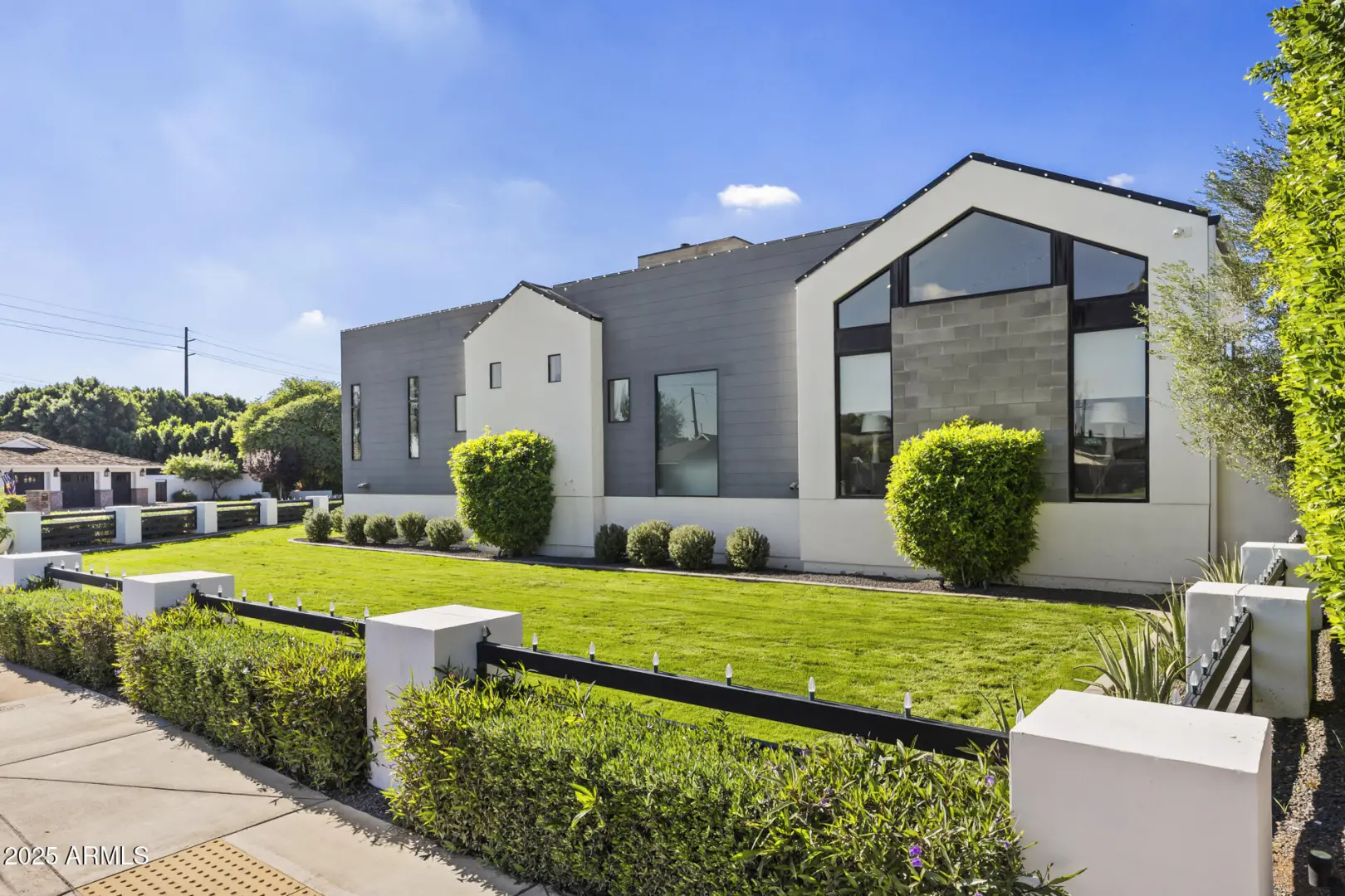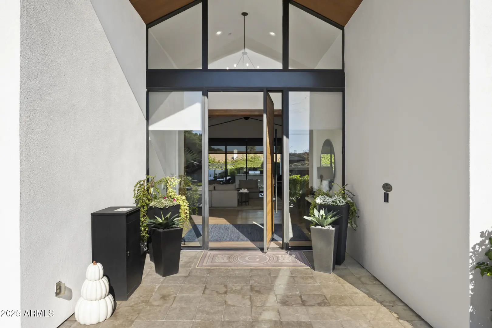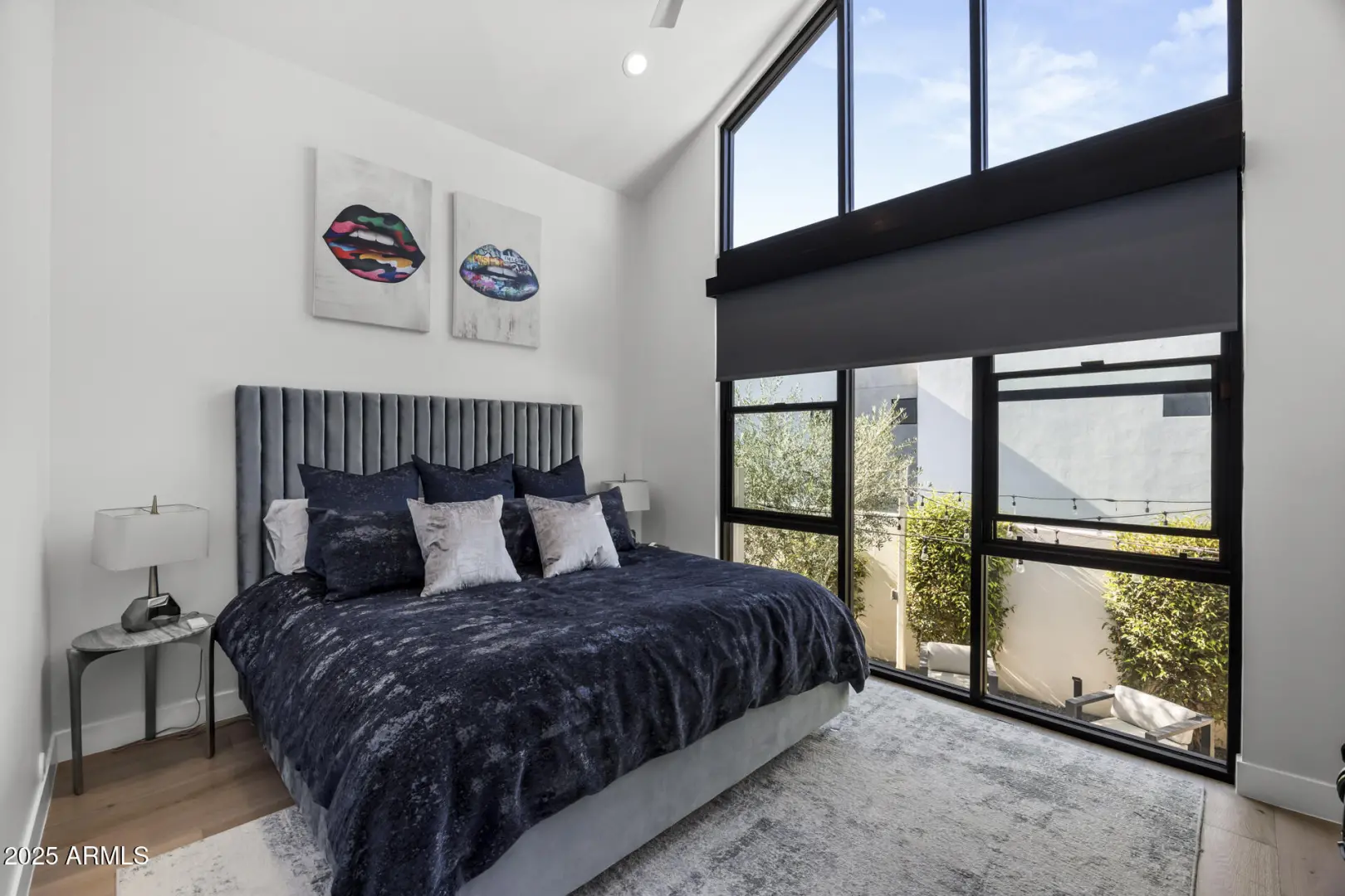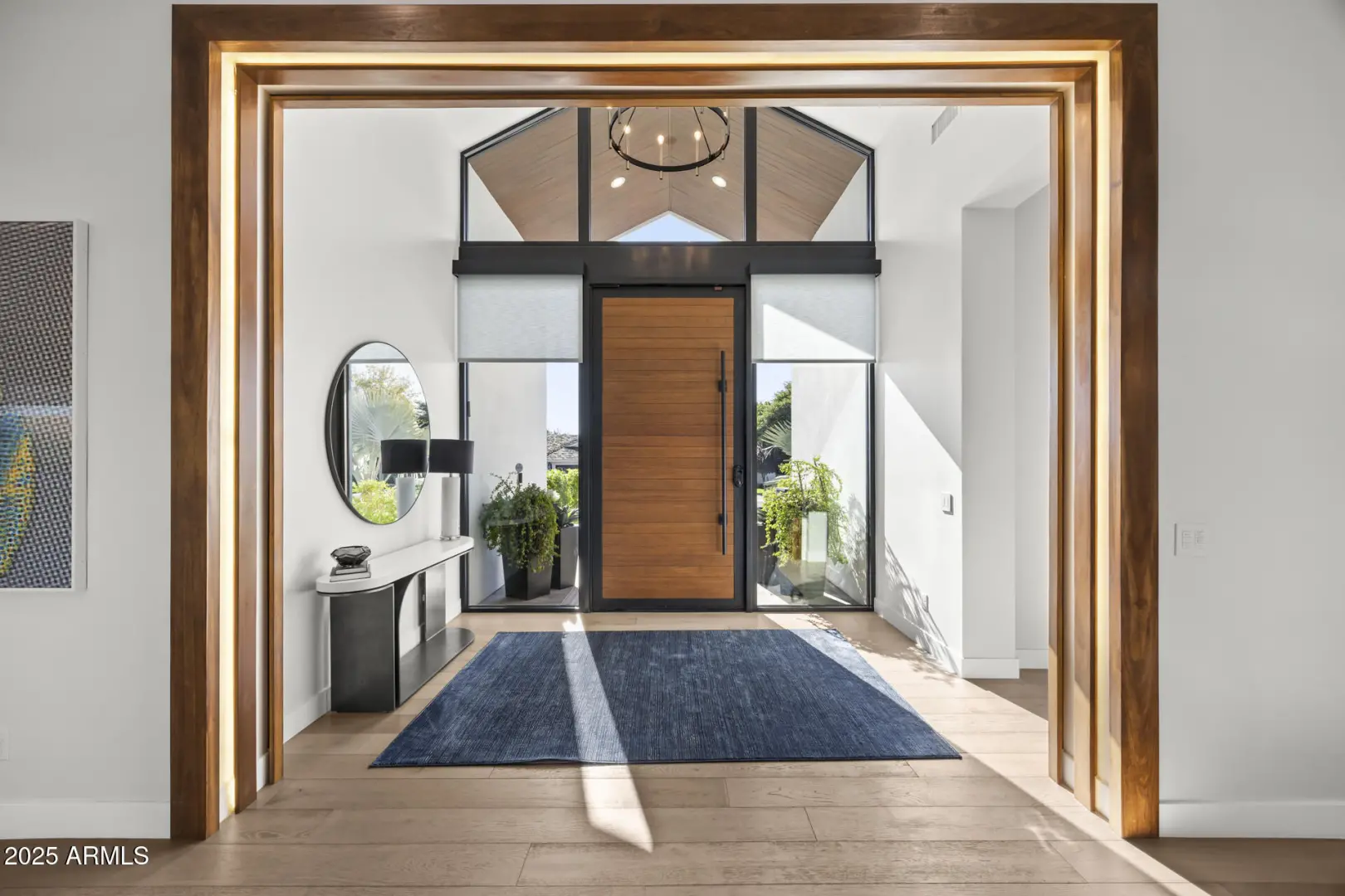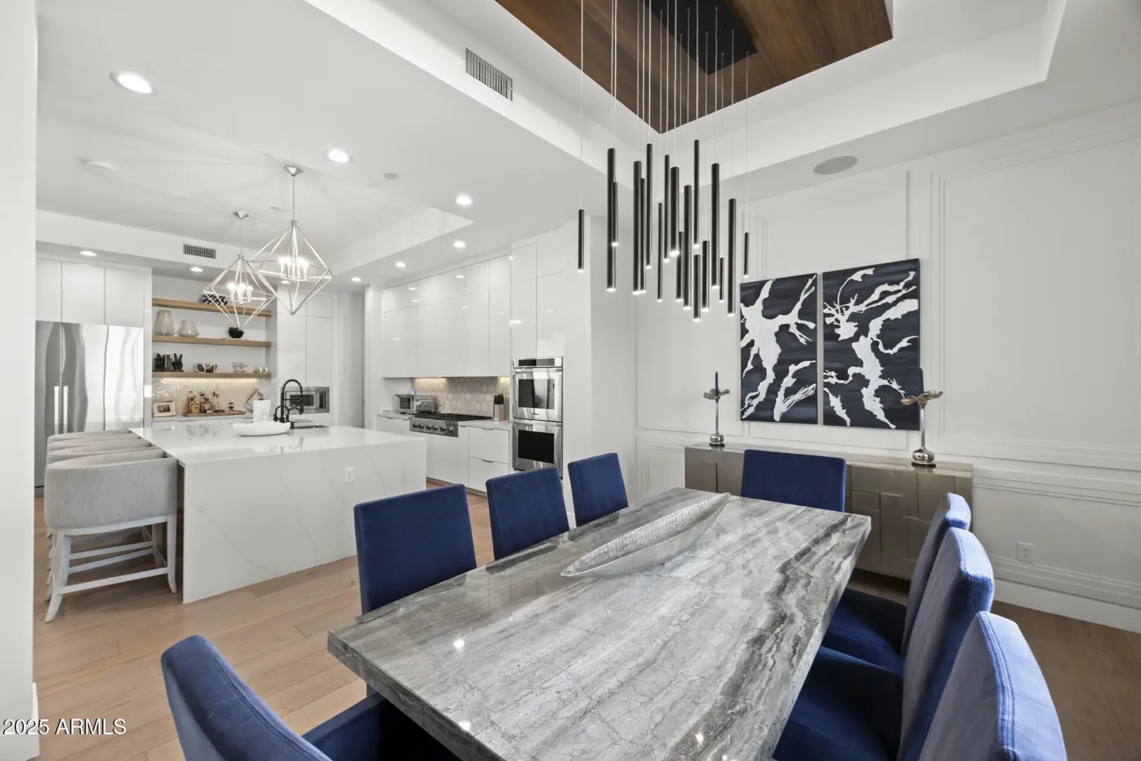 This modern, thoughtfully designed home offers 4 bedrooms, 4.5 baths, and well-planned living spaces that balance comfort and style. The main living area features a striking marble fireplace and exposed beams, creating a clean and elevated look. The open gourmet kitchen includes sleek white cabinetry and a large Calacatta quartz island that connects easily to the dining area, making the space great for everyday living and entertaining. The primary suite provides a relaxing setting with its own fireplace and floor-to-ceiling windows that bring in natural light and calm views. The primary bath includes dual vanities, a walk-in shower, a soaking tub, and a spacious walk-in closet. Outside, the home offers a private backyard with a sparkling pool,