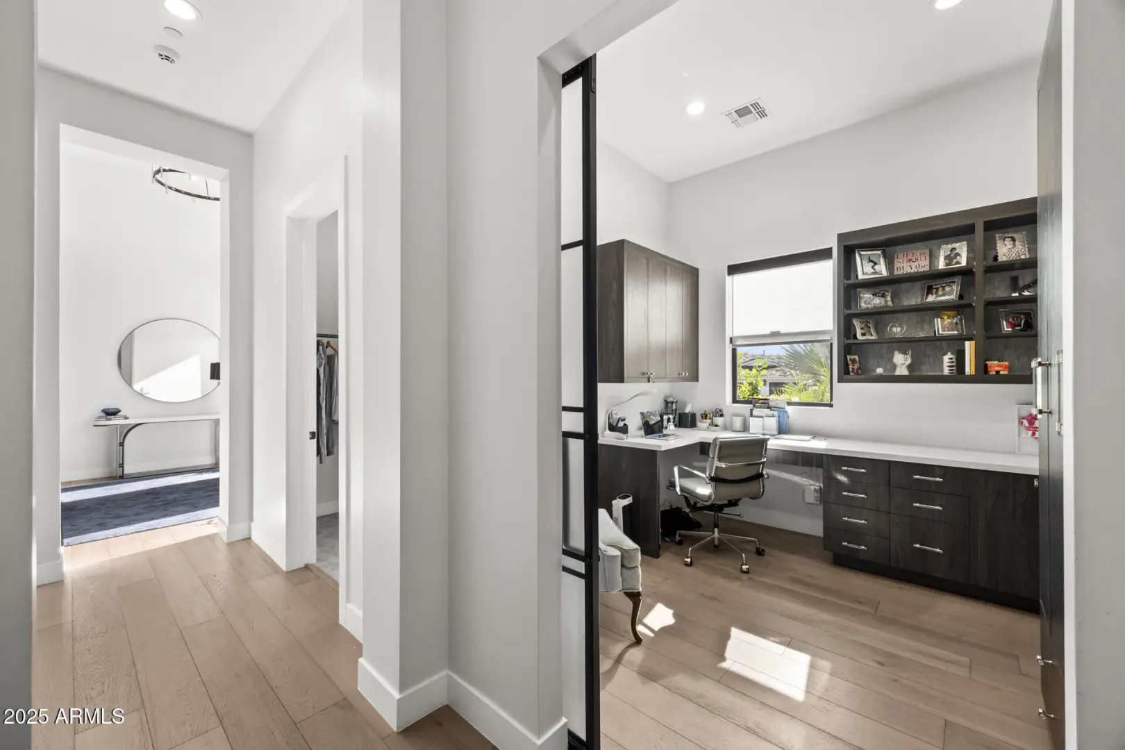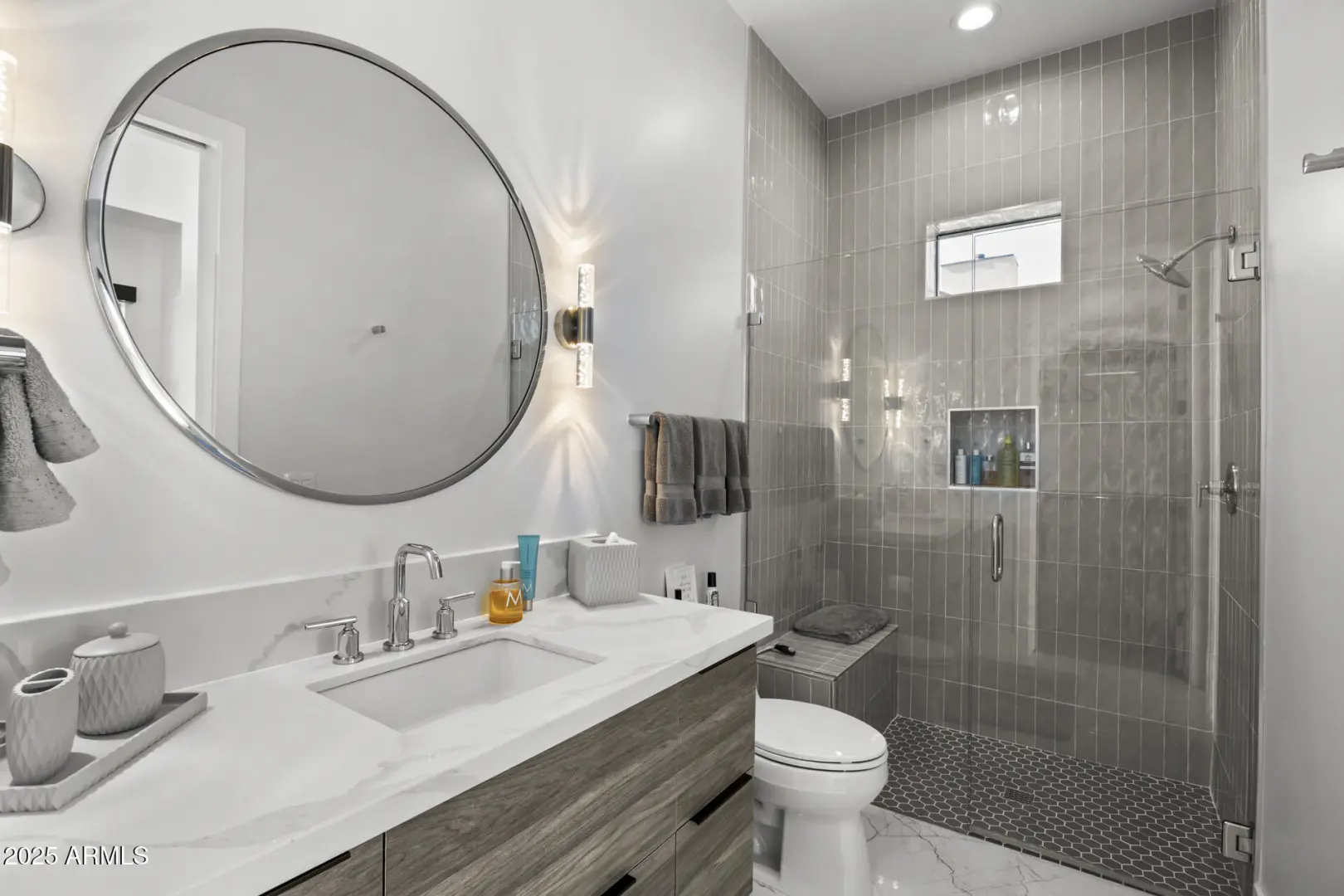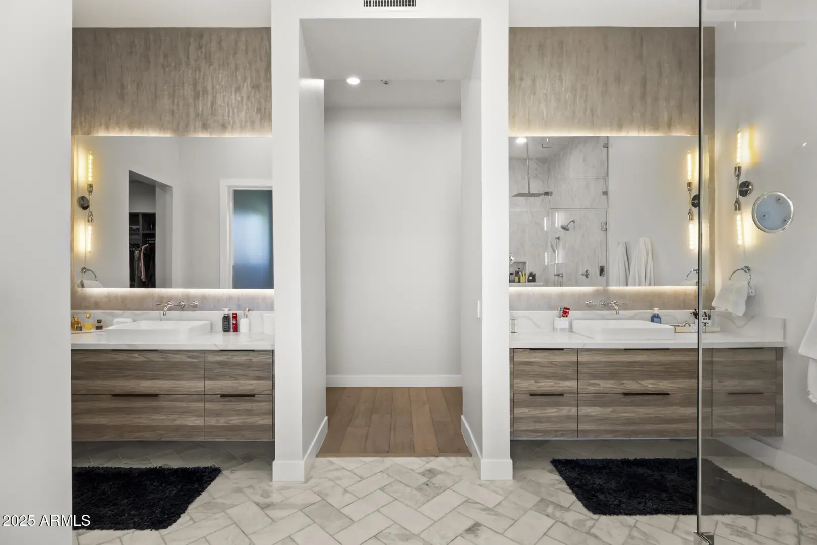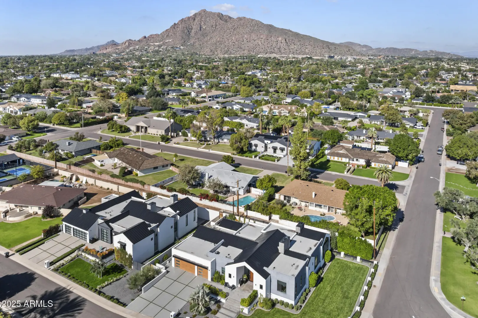 This modern, thoughtfully designed home offers 4 bedrooms, 4.5 baths, and well-planned living spaces that balance comfort and style. The main living area features a striking marble fireplace and exposed beams, creating a clean and elevated look. The open gourmet kitchen includes sleek white cabinetry and a large Calacatta quartz island that connects easily to the dining area, making the space great for everyday living and entertaining. The primary suite provides a relaxing setting with its own fireplace and floor-to-ceiling windows that bring in natural light and calm views. The primary bath includes dual vanities, a walk-in shower, a soaking tub, and a spacious walk-in closet. Outside, the home offers a private backyard with a sparkling pool,
